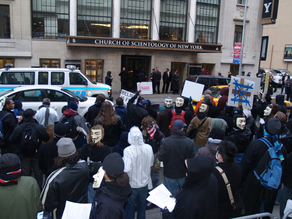 Mas o auge dessa mobilização espontânea foi quando no dia 10 de fevereiro de 2008, quando sete mil usuários do 4chan apareceram em instalações da igreja da Cientologia ao redor do mundo vestindo o máscaras do Guy Fawkes (do filme V de Vingança, das Irmãs Watchowski), carregando cartazes com slogans anti-cientologia. Eles também apareciam com caixas de som tocando “Never Gonna Give You Up”, de Rick Astley e dispersavam sorrateiramente após uma hora (ALT, 2020, p.217).