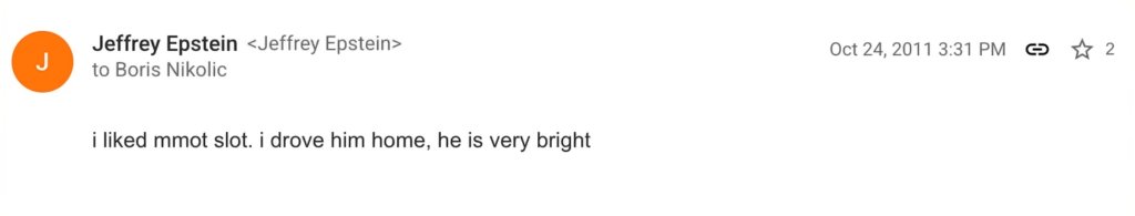 Documentos liberados sobre o caso Jeffrey Epstein revelam que no dia 20 de outubro de 2011, Boris Nikolic, investidor de risco e antigo conselheiro de Bill Gates, lhe envia um perfil de Moot na wikipedia dizendo que “ele era um cara legal e que ele devia conhecê-lo”.