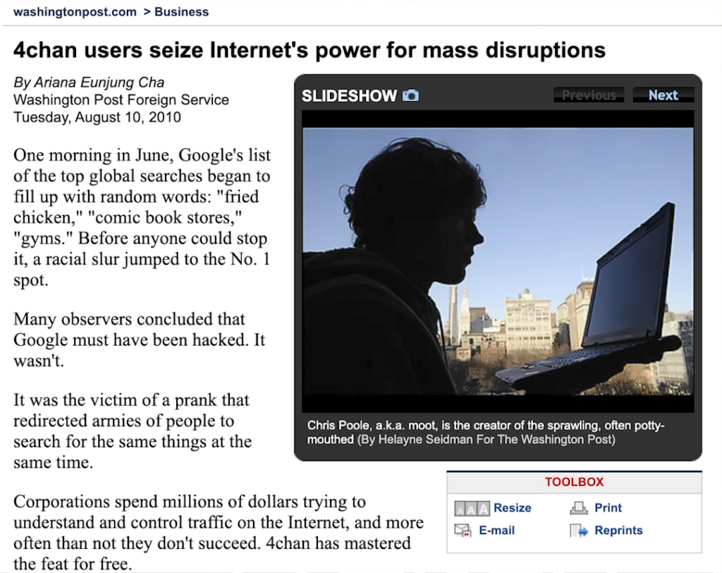 No ano seguinte, os usuários do 4chan elegeram o criador do site, moot, como pessoa do ano da revista Times em uma votação aberta em seu site. Moot recebera mais votos que nomes como Barack Obama, Vladimir Putin e Oprah Winfrey. Não era possível dizer se havia um líder para mobilização. Tudo apontava para uma mobilização legitimamente orgânica. Não demorou muito até que o site chamasse atenção de figuras peculiares como Steve Bannon e Jeffrey Epstein.