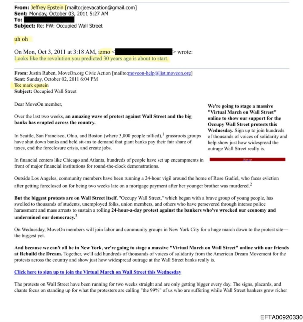 No dia 3 de outubro de 2011, Mark Epstein manda um email ao seu irmão, Jeffrey, dizendo que “parece que a revolução que você previu 30 anos atrás está prestes para começar”. Jeffrey responde “uh oh”.